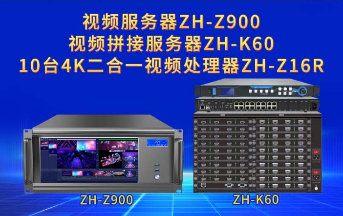應用產(chǎn)品:視頻服務(wù)器ZH-Z900+視頻拼接服務(wù)器ZH-K60+10臺4K二合一視頻處理器ZH-Z16R,完美帶載!
